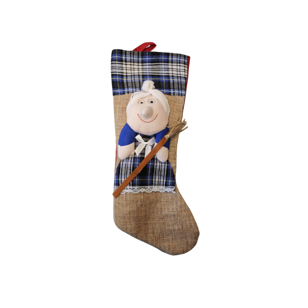 Questa calza è l’accessorio ideale per celebrare l’Epifania 2026 (o l’anno corrente). La base in juta naturale conferisce un look rustico e autentico, mentre il risvolto e il vestito del pupazzo Befana in tessuto tartan blu aggiungono un tocco moderno e festivo.