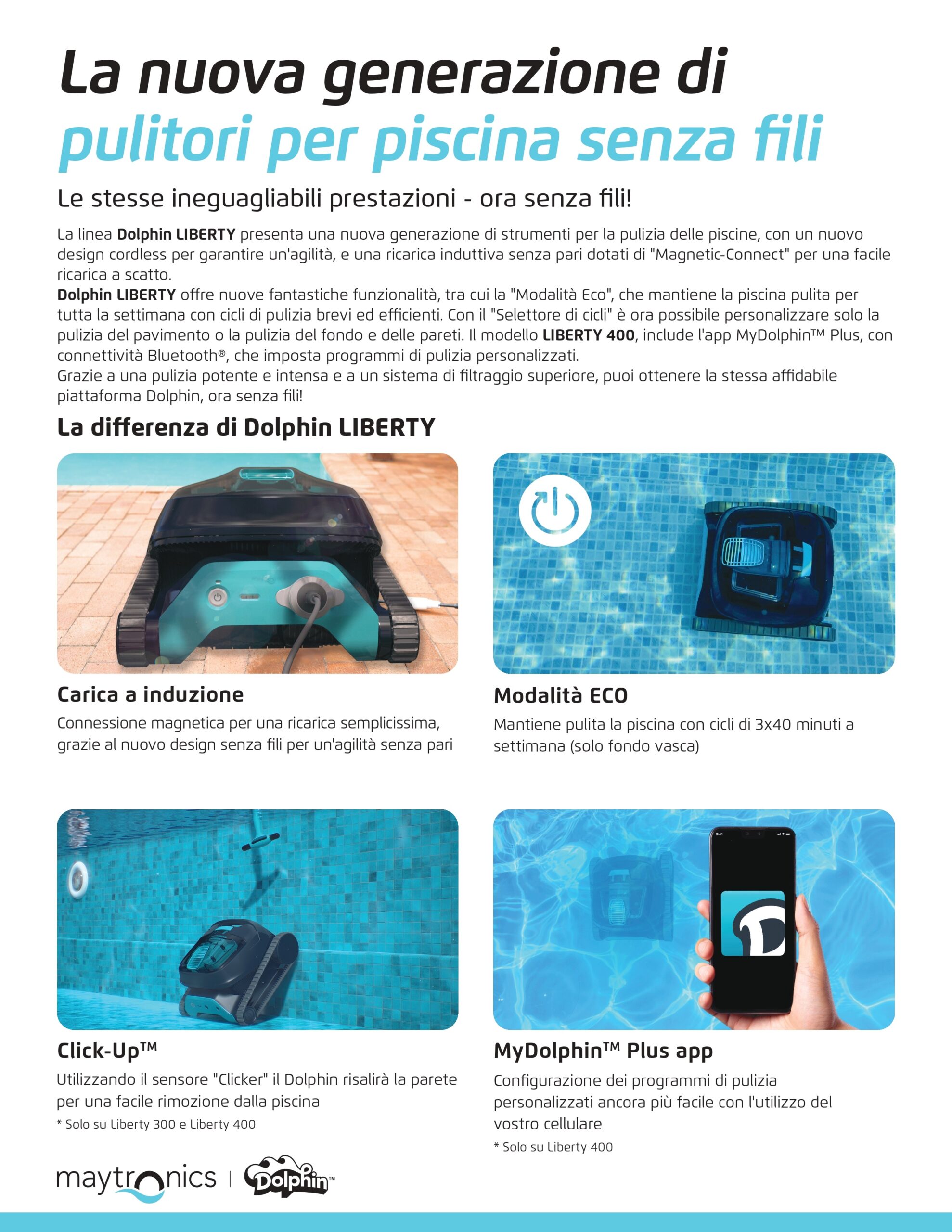 Scopri la libertà assoluta con il nuovo Dolphin LIBERTY 300, il robot pulitore di ultima generazione che unisce le leggendarie prestazioni Dolphin a un design totalmente senza fili. Grazie alla sua agilità senza pari e alla tecnologia di ricarica a induzione, mantenere la tua piscina impeccabile non è mai stato così semplice e futuristico.
