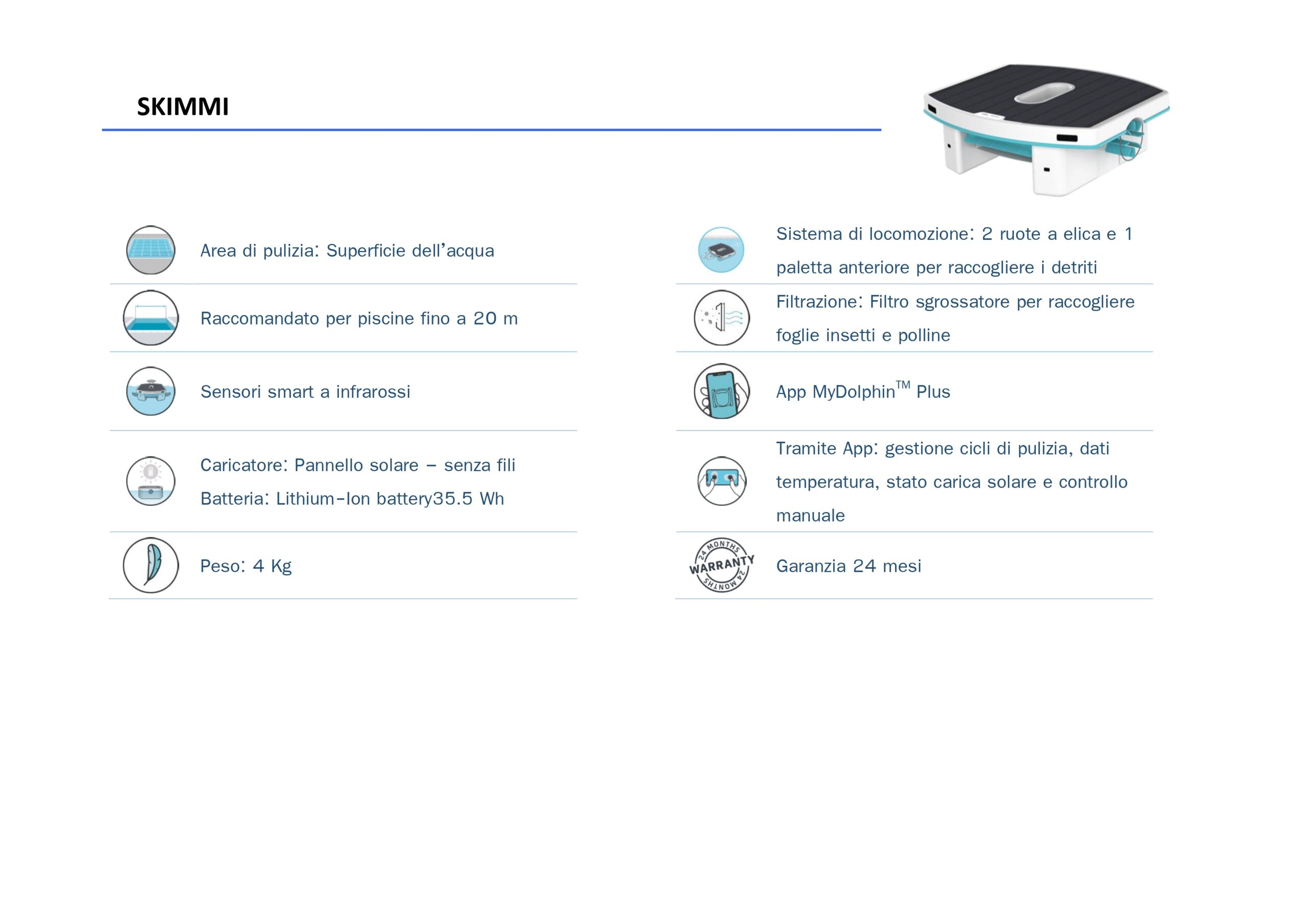 • Energia Infinita: Dotato di pannelli solari ad alta efficienza, Skimmi si ricarica costantemente durante il giorno. Non necessita di cavi, prese elettriche o cicli di ricarica manuale.