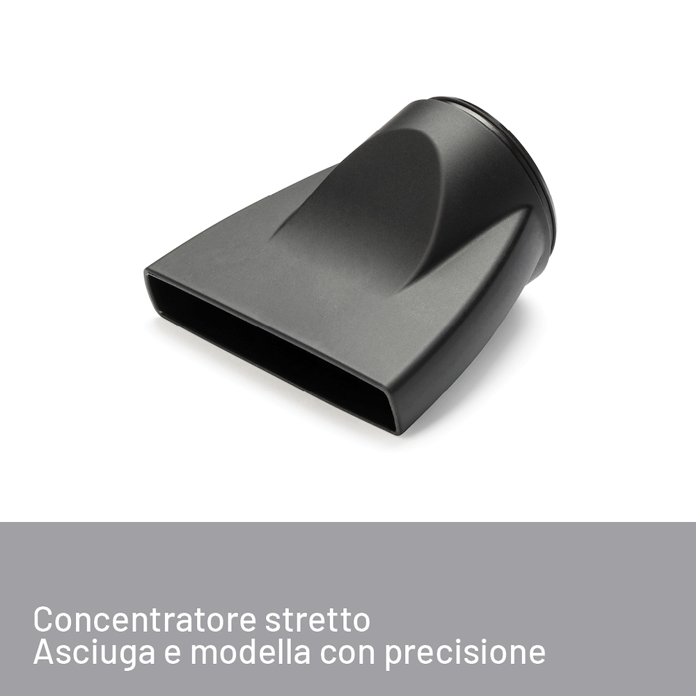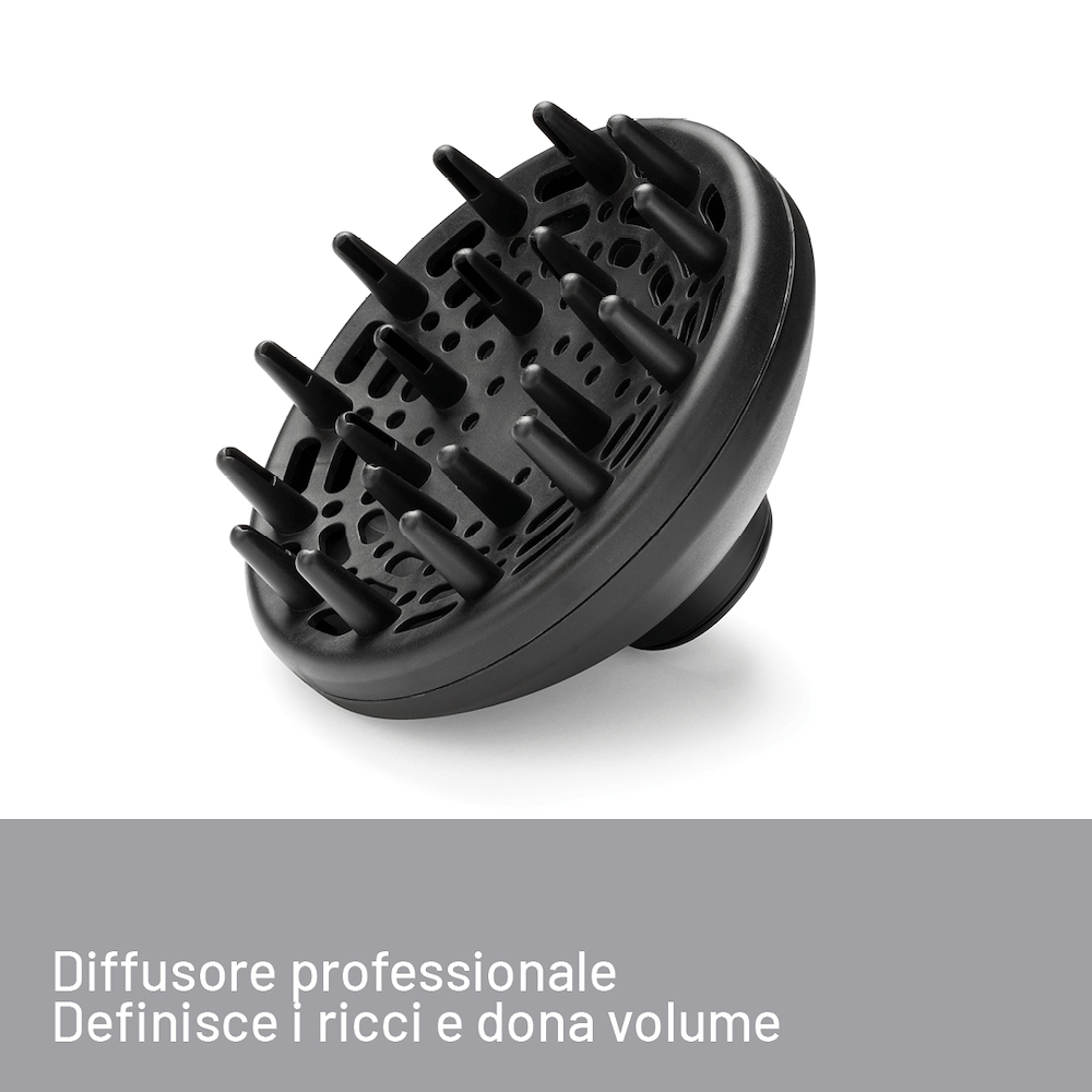 Nella confezione sono inclusi accessori di alta qualità per soddisfare ogni esigenza di look. Il Convogliatore Stretto è ideale per dirigere il flusso d’aria con precisione e ottenere un liscio impeccabile, mentre il Diffusore Professionale è l’alleato perfetto per chi ha capelli ricci o mossi, garantendo volume e definizione senza spettinare.