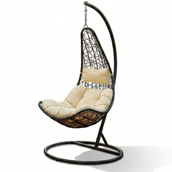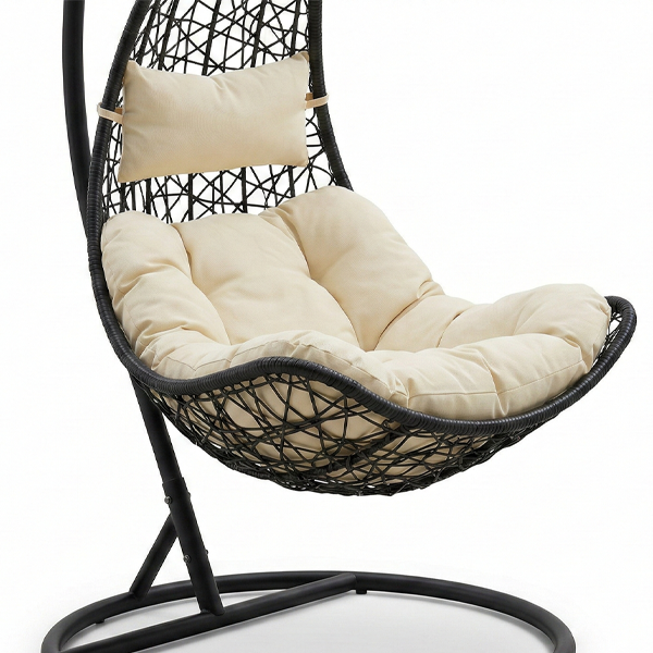 La struttura autoportante in metallo nero dal design arcuato garantisce massima stabilità, mentre il cesto in rattan sintetico intrecciato accoglie il corpo in un abbraccio ergonomico. Completa di morbidi cuscini imbottiti color crema, è progettata per resistere agli agenti atmosferici mantenendo inalterata la sua bellezza nel tempo.
