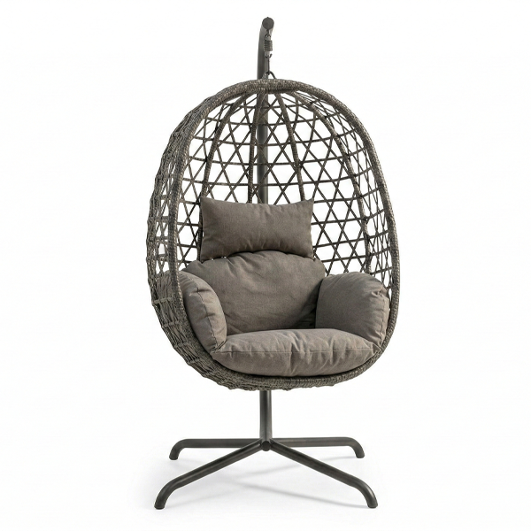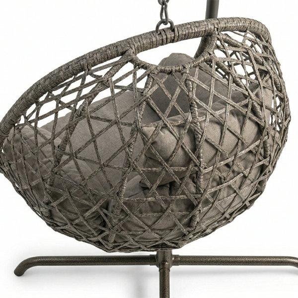 La poltrona si distingue per il suo cesto sospeso realizzato in polietilene con un elegante effetto rattan grigio scuro. Questo materiale non solo conferisce un look artigianale e moderno, ma è scelto appositamente per la sua resistenza agli agenti atmosferici, rendendolo ideale per l’uso outdoor.