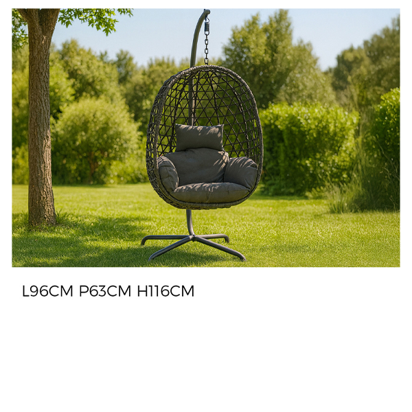 La sicurezza è garantita da una robusta struttura portante in acciaio verniciato, progettata per offrire stabilità e sostenere il movimento oscillatorio in totale sicurezza. Per un’esperienza di relax completa, la poltrona include morbidi cuscini imbottiti sia per la seduta che per lo schienale, rifiniti in una tonalità grigio antracite che si abbina perfettamente alla struttura.