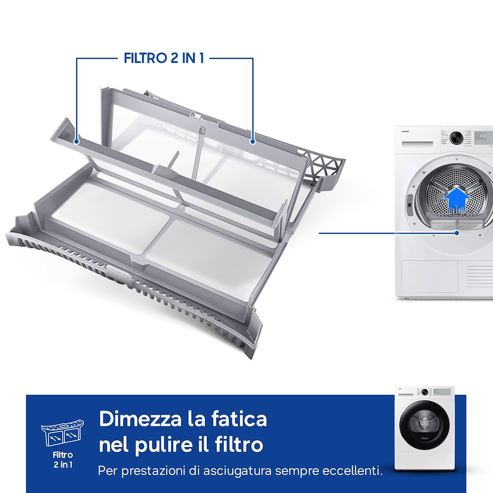 Il modello DV90DG52A0AHET offre una suite completa di opzioni per personalizzare l’esperienza di asciugatura, tra cui la funzione Stiro Facile (Antipiega) che riduce le pieghe sui tessuti e la selezione del livello di asciugatura su 3 diversi stadi. Gli utenti possono inoltre optare per la selezione manuale del tempo o attivare il segnale acustico “Asciugatutto” al termine del ciclo. La luce interna al cestello facilita le operazioni di carico, assicurando che nessun capo, anche il più piccolo, venga dimenticato all’interno dopo l’utilizzo.
