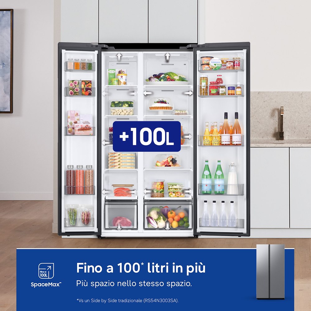 Il Samsung RS57DG400EM9EF (Codice 930976) è un frigorifero Side-by-Side a libera installazione progettato per offrire una capacità di conservazione straordinaria e un design moderno in finitura Metal Inox. Caratterizzato da una capacità netta totale di 583 litri, suddivisa tra i 375 litri del vano frigorifero e i 208 litri del congelatore posto a sinistra, questo modello della Serie 4000DC integra la tecnologia Air Space AI per ottimizzare gli spazi e l’efficienza. La connettività Wi-Fi integrata permette una gestione intelligente del dispositivo, rendendolo un elemento centrale della casa smart contemporanea.