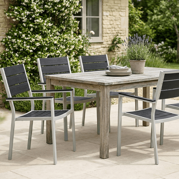 Versatilità: Grazie al design pulito e ai materiali idrorepellenti, è la scelta ideale sia per un tavolo da pranzo all’aperto che come seduta aggiuntiva per zone relax.