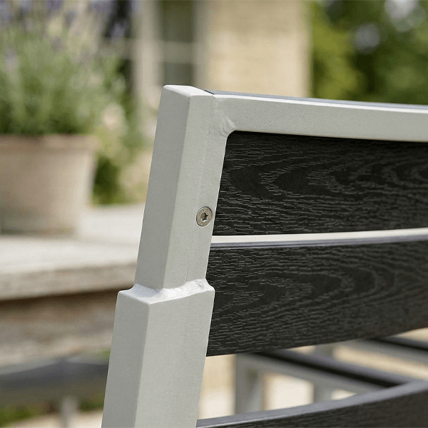 Finitura Effetto Legno: La seduta e lo schienale presentano doghe in plastica (HDPE) color antracite che riproducono l’estetica del legno, eliminando però ogni necessità di manutenzione o verniciatura periodica.