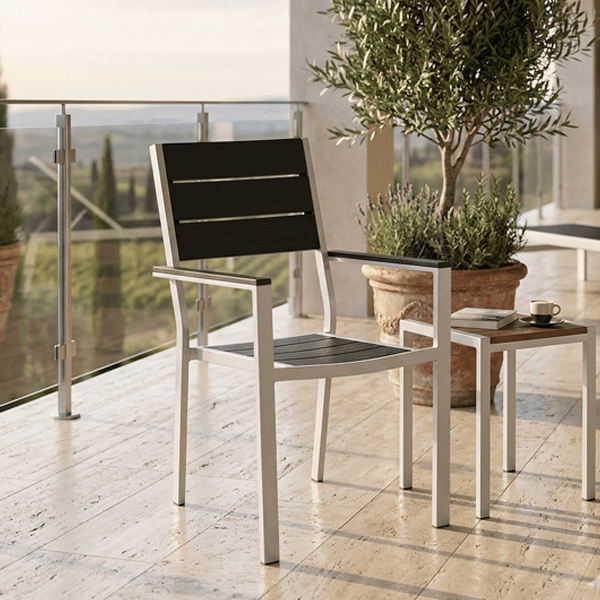 Aggiungi un tocco di eleganza contemporanea al tuo spazio outdoor con questa sedia da esterno professionale. Progettata per resistere nel tempo senza rinunciare allo stile, combina una robusta struttura bianca con doghe moderne color antracite, rendendola perfetta per giardini, terrazzi e dehor di locali.
