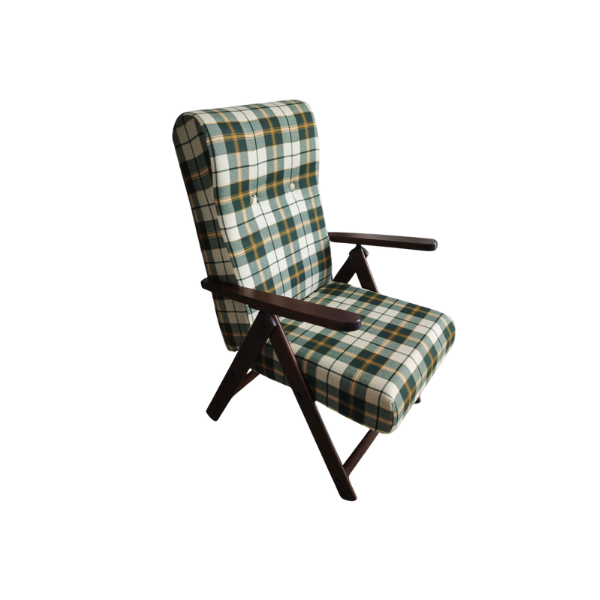 Il comfort è al centro del progetto: la seduta e lo schienale sono completamente imbottiti per offrirti un sostegno morbido durante ogni momento di relax. Il rivestimento in tessuto presenta un raffinato motivo a quadri o a mattonelle nelle tonalità naturali del verde e del beige, una combinazione cromatica rilassante che si sposa armoniosamente con ambienti sia classici che contemporanei.