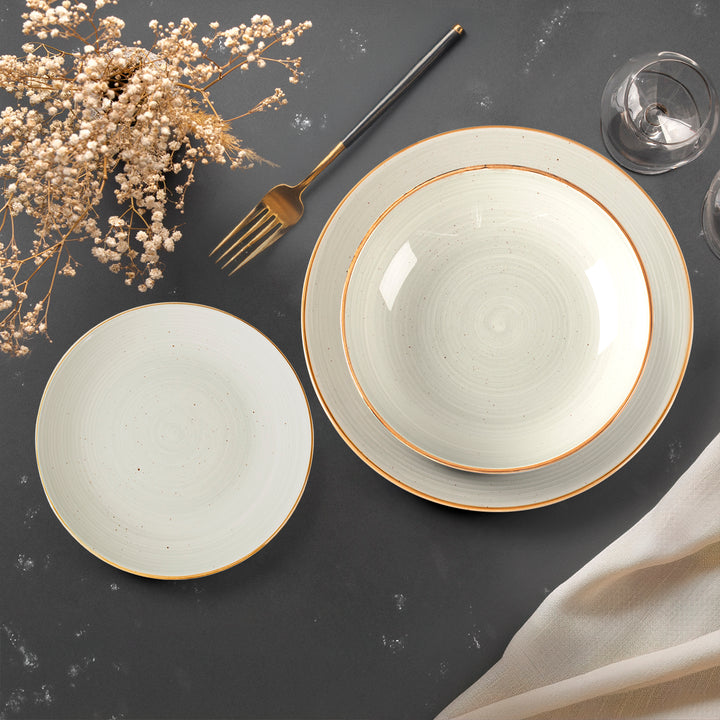 Design Unico: La texture a cerchi concentrici e l’effetto “speckled” (puntinato) donano un tocco artigianale a ogni pezzo. Il sottile bordo color ocra crea un elegante stacco visivo che incornicia le tue creazioni culinarie.