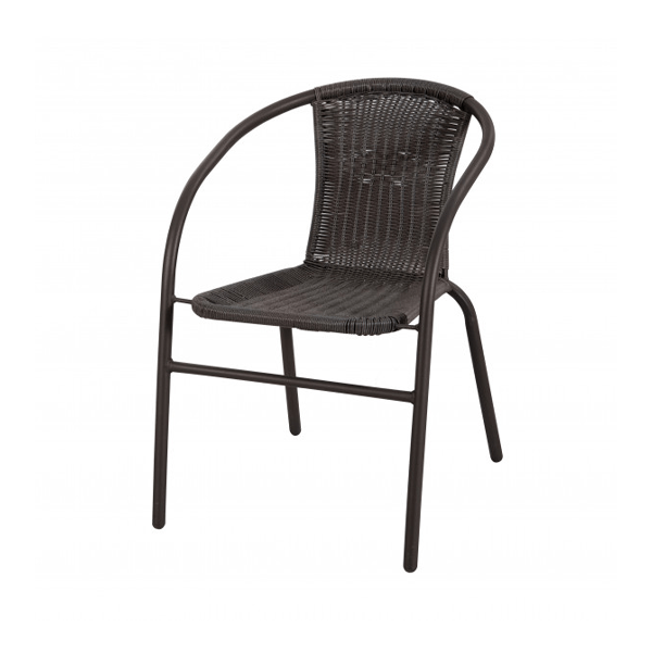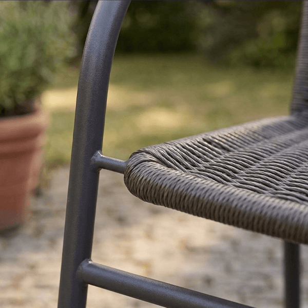 La particolare finitura marrone esalta la trama intrecciata della seduta, conferendo al set un aspetto artigianale che non rinuncia alla resistenza dei materiali moderni.