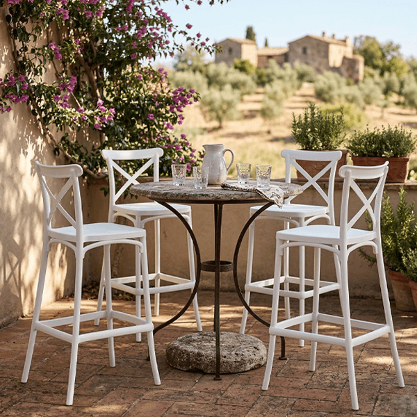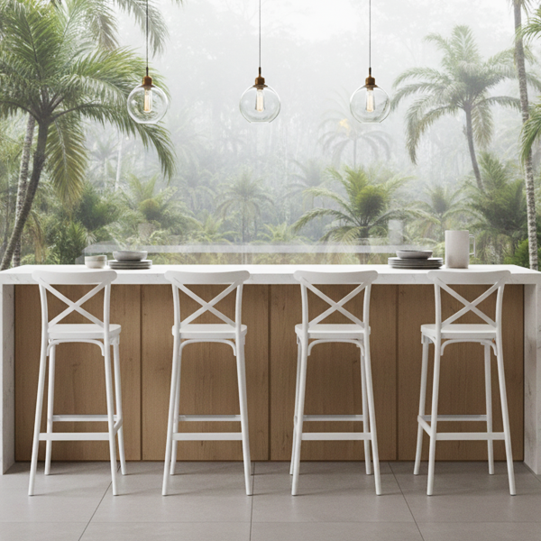 Materiale High-Tech: Ogni sgabello è realizzato interamente in polipropilene bianco, un materiale estremamente durevole e leggero.