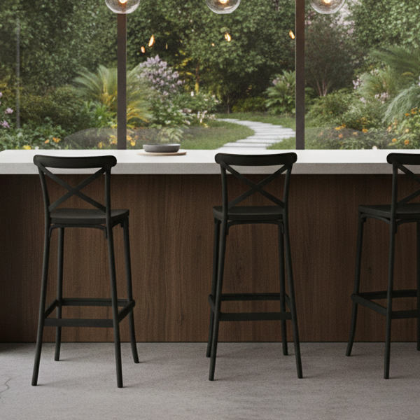Il design Cross-Back (schienale a incrocio) richiama le classiche sedute parigine, reinterpretate in chiave moderna grazie all’uso del polipropilene grigio antracite, un materiale tecnico che assicura una longevità eccezionale.