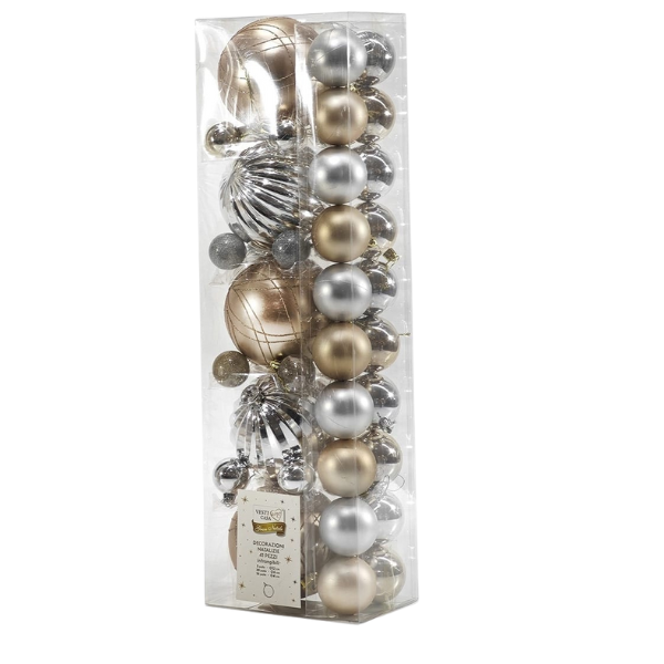 Il box, alto e trasparente, contiene un generoso assortimento di 41 sfere nei colori Oro,Argento e Bronzo/Rame che si combinano perfettamente per creare un look armonioso e luminoso.