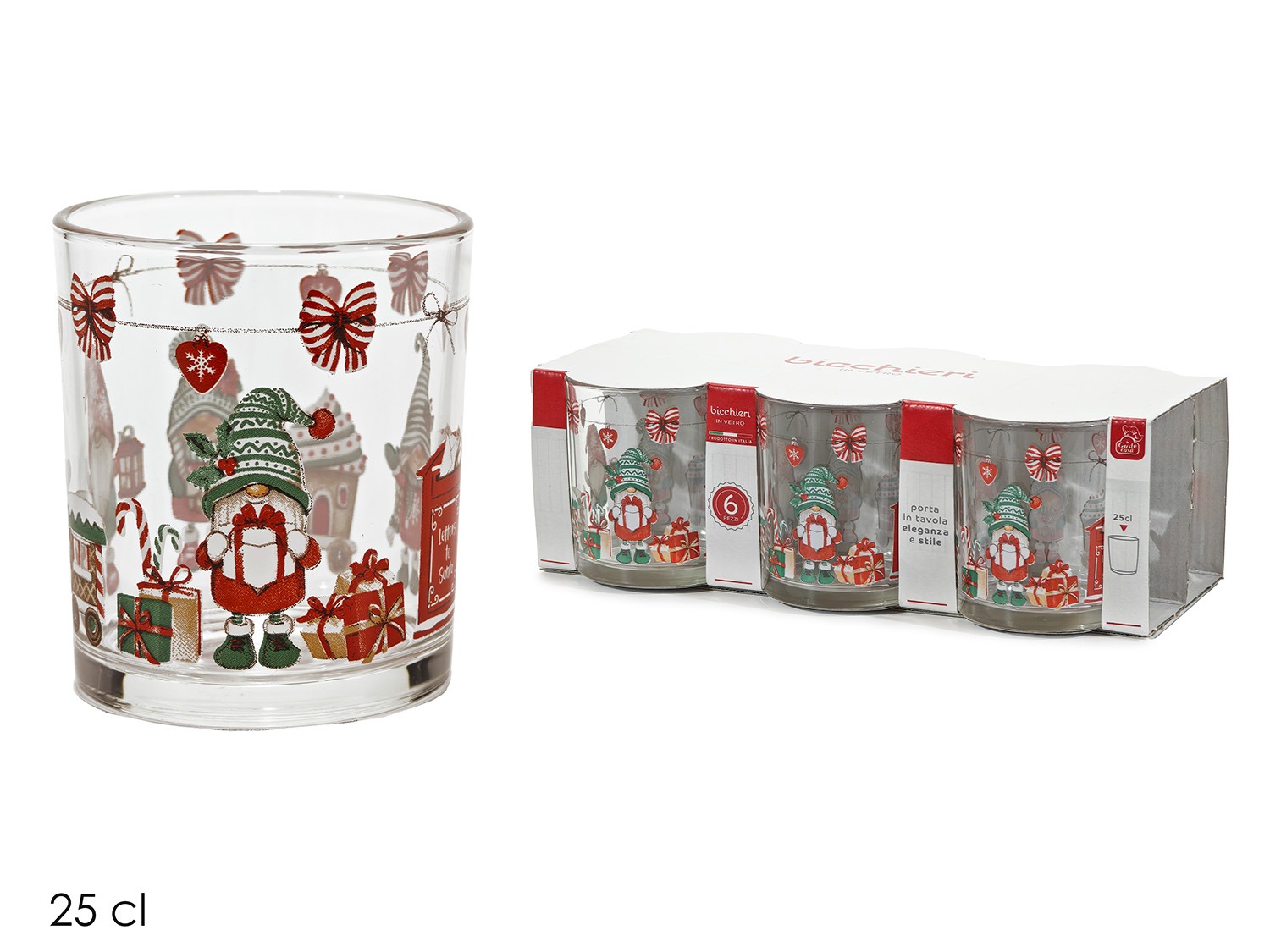 Set 6 Bicchieri 25 cl con Fantasia Gnomi Natalizi e Fiocchi