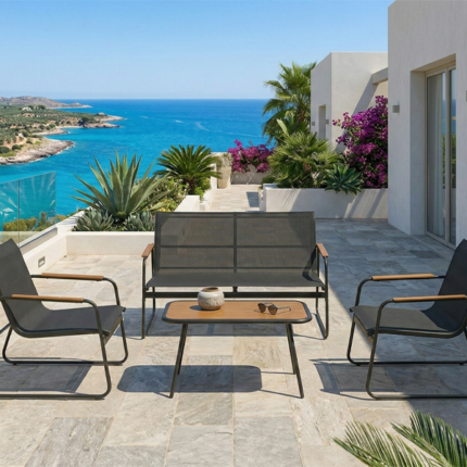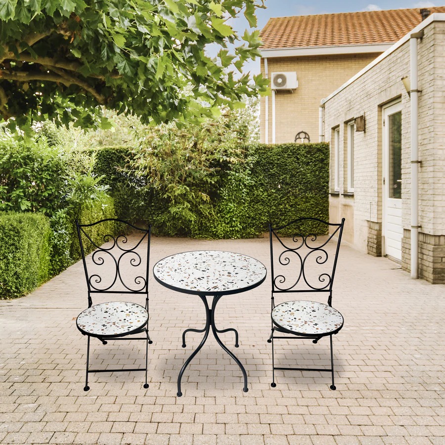 Il fascino della tradizione incontra la solidità del design moderno. Questo set coordinato, composto da tavolino e due sedie, si ispira ai classici arredi delle ville mediterranee. Il top con effetto mosaico crea un gioco cromatico vivace e ricercato, capace di trasformare un semplice balcone o un angolo del giardino in uno spazio accogliente e ricco di stile.