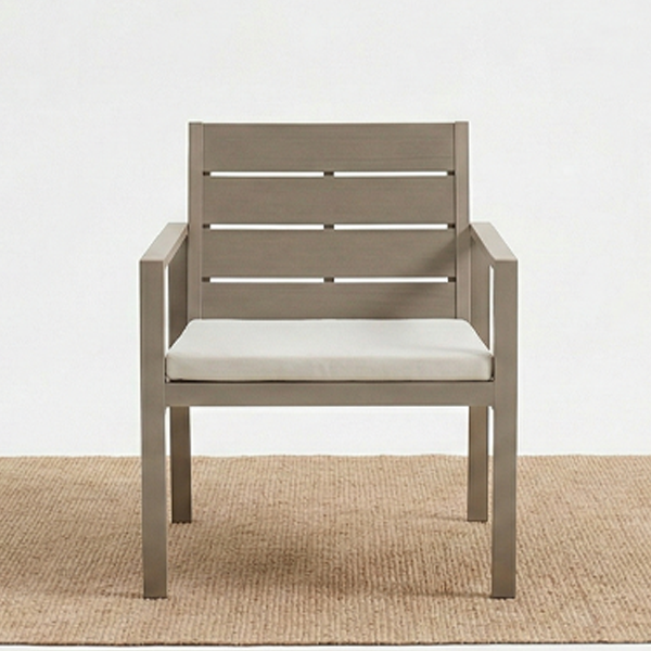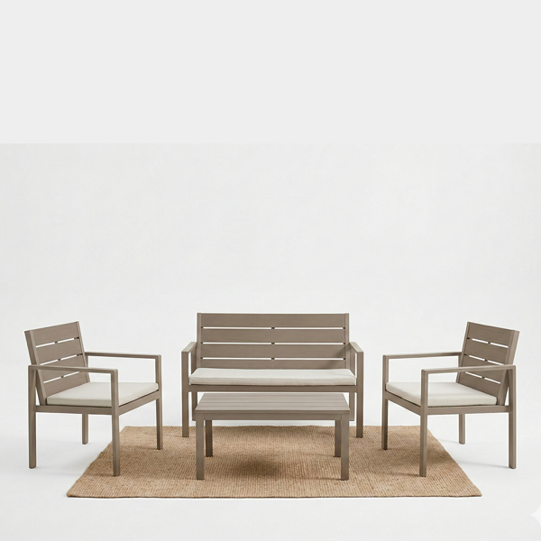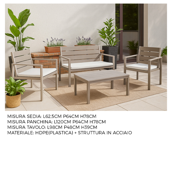 Il salotto è costruito su una solida struttura in acciaio, garantendo stabilità e resistenza nel tempo. L’estetica è valorizzata dall’uso della plastica HDPE (Polietilene) con un raffinato effetto legno color Tortora, presente sulle sedute, sugli schienali, sui braccioli e sulla superficie del tavolino. Questo materiale non solo dona un tocco naturale all’ambiente, ma è anche estremamente pratico: resiste alle intemperie e richiede una manutenzione minima.