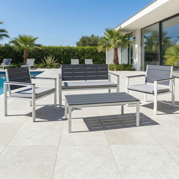 A differenza dei classici set in rattan, questo salotto in acciaio e HDPE offre una manutenzione quasi nulla. È l’ideale per chi cerca un arredo che rimanga impeccabile stagione dopo stagione, resistendo bene anche in zone con alta umidità o esposizione diretta ai raggi UV.