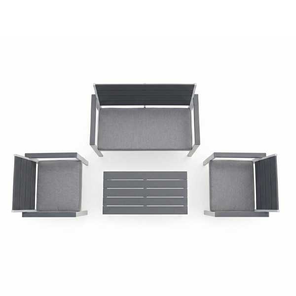 • Materiali: Acciaio (struttura), HDPE effetto legno (superfici), Tessuto impermeabile (cuscini).