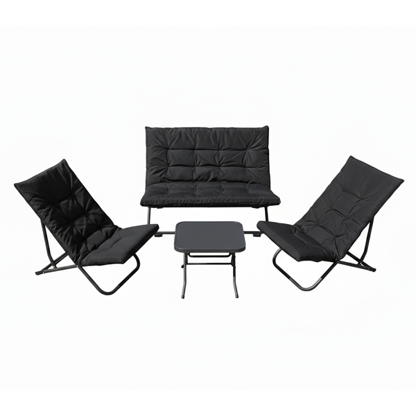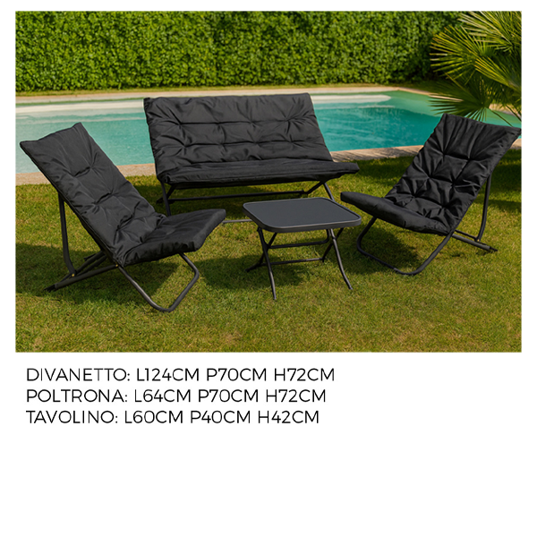 Il salotto si distingue per i suoi cuscini ad alto comfort, caratterizzati da un’imbottitura morbida e accogliente che invita al relax totale. Il rivestimento è realizzato in poliestere 600D color Grigio Scuro, un tessuto tecnico robusto e durevole.