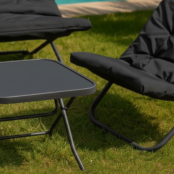 A completare il set, il tavolino coordinato con top in vetro temperato: una superficie elegante, stabile e facile da igienizzare, perfetta per i tuoi aperitivi all’aperto.