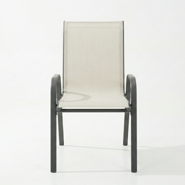 Seduta Fresca e Durevole: Le sedie presentano schienale e seduta in textilene beige, materiale traspirante che assicura comfort anche in estate e resistenza agli agenti atmosferici.