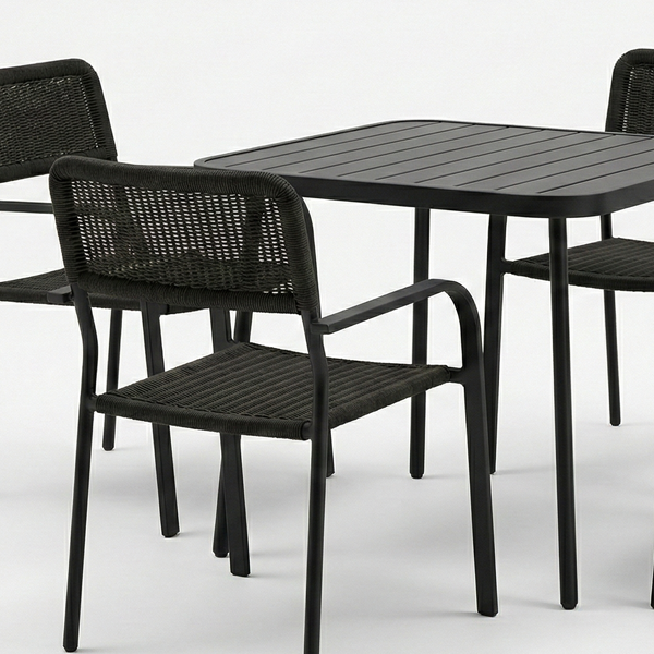 Set Completo “Ready-to-use”: Una soluzione d’arredo pronta che include un tavolo quadrato da 80×80 cm e 4 sedie coordinate.