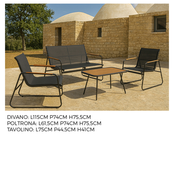 Questo salotto è la scelta ideale per chi cerca un arredo facile da pulire e resistente agli agenti atmosferici. La combinazione di acciaio e textilene lo rende leggero visivamente ma estremamente robusto, perfetto per godersi l’estate in totale relax.
