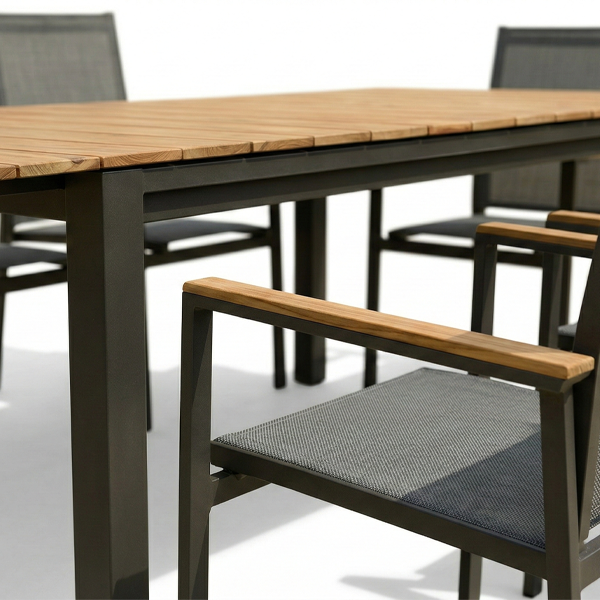 Il set è costruito su una robusta struttura in alluminio nero, materiale d’eccellenza per l’esterno grazie alla sua leggerezza e naturale resistenza alla corrosione. Il piano del tavolo è realizzato in Polywood, un materiale innovativo che offre tutto il fascino estetico del legno senza la necessità di manutenzione costante, resistendo perfettamente a umidità e raggi UV.