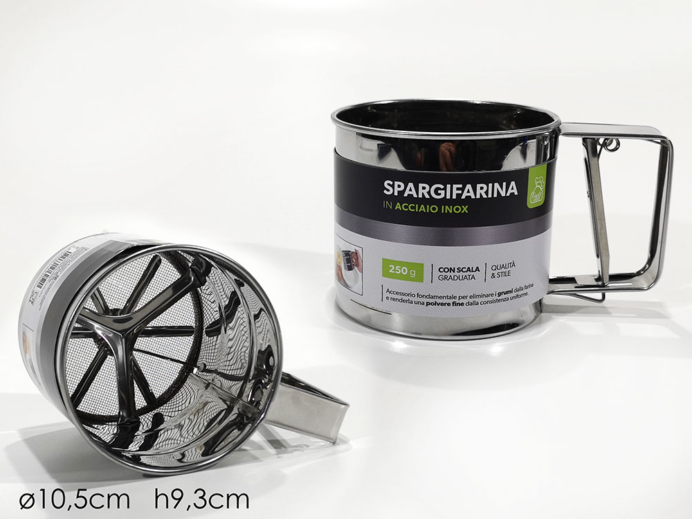 Ottieni impasti perfetti e polveri finissime con lo spargifarina professionale a tazza. Questo strumento, essenziale per ogni appassionato di pasticceria e panificazione, è progettato per eliminare i grumi dalla farina e garantire una consistenza uniforme e leggera a ogni tua preparazione.