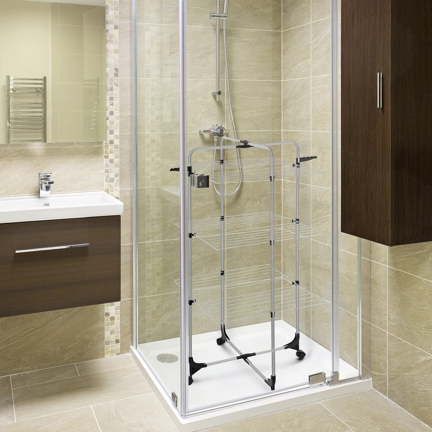 Massimizza lo spazio in casa con lo stendibiancheria a torre Asso3, la soluzione intelligente e robusta per asciugare il tuo bucato in modo efficiente. Realizzato in acciaio resistente, questo stendino verticale offre una capacità di stenditura impressionante in un ingombro ridotto, rendendolo perfetto per appartamenti, piccoli spazi o per essere posizionato direttamente nel box doccia.