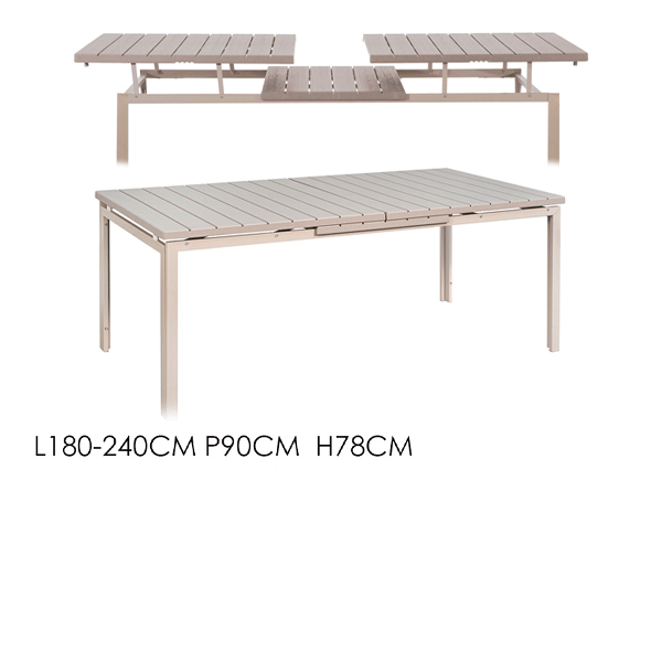 Progettato per resistere all’esterno, il tavolo presenta una solida struttura in acciaio color Beige, che assicura stabilità e durevolezza. Il top è realizzato con doghe effetto legno in plastica HDPE (Polietilene ad alta densità) color Tortora. Questo materiale all’avanguardia offre l’estetica calda del legno con il vantaggio di essere completamente idrorepellente, resistente ai raggi UV e facilissimo da pulire, mantenendo il colore inalterato negli anni.