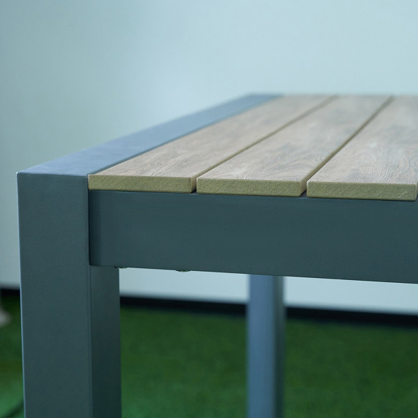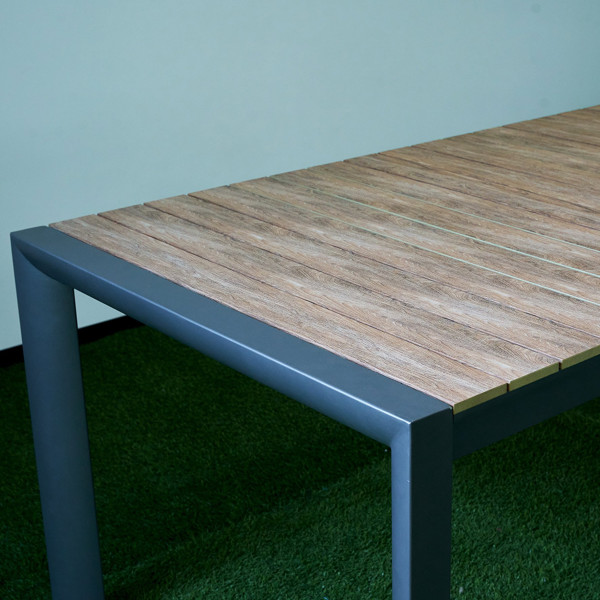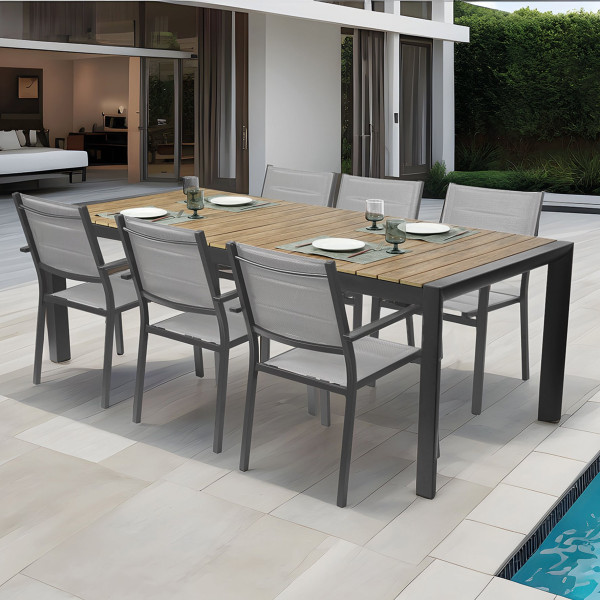 Porta l’eleganza del legno e la resistenza dell’alluminio nei tuoi spazi con questo Tavolo Allungabile di alta gamma. Progettato per chi non vuole scendere a compromessi tra estetica e praticità, il tavolo presenta un raffinato top con doghe in Polywood, un materiale innovativo che offre tutto il calore visivo del legno naturale ma con una resistenza superiore agli agenti atmosferici e una manutenzione minima.