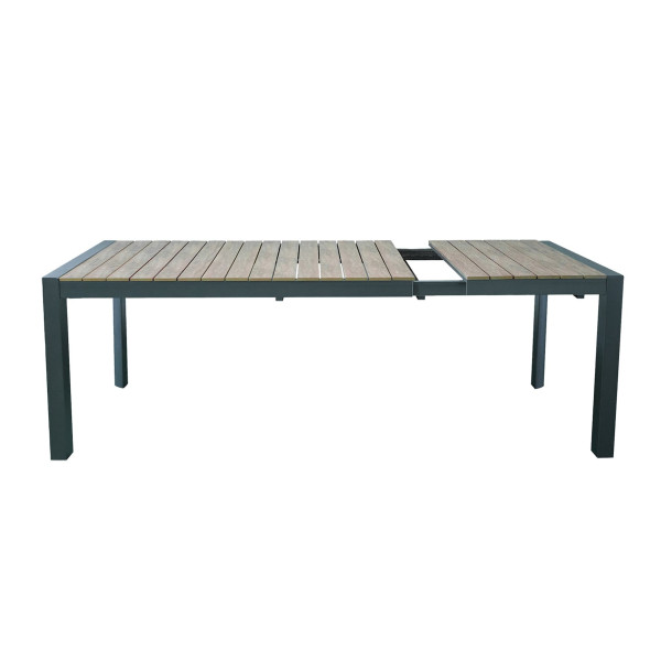 La solida struttura in alluminio verniciato garantisce stabilità e leggerezza, mentre l’intelligente sistema di apertura con gambe a scorrimento permette di estendere il piano facilmente, mantenendo le gambe sempre alle estremità per offrire il massimo comfort a tutti i commensali.