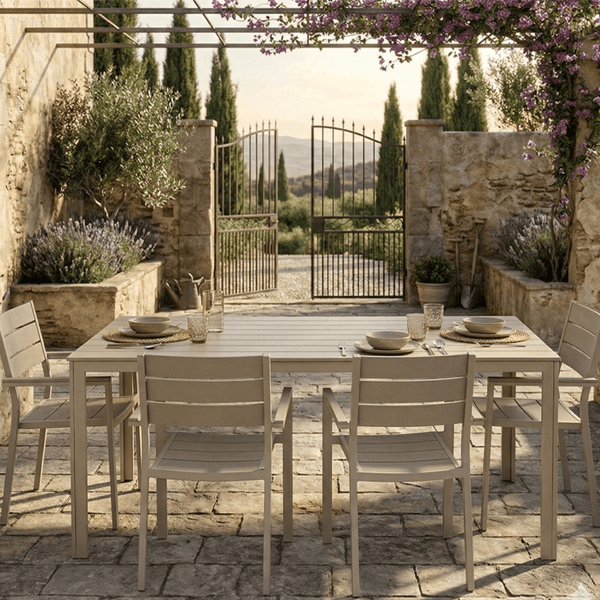 Perché sceglierlo: È la soluzione definitiva per chi desidera un tavolo grande, facile da pulire e capace di resistere a lungo alle intemperie senza perdere il suo fascino contemporaneo.